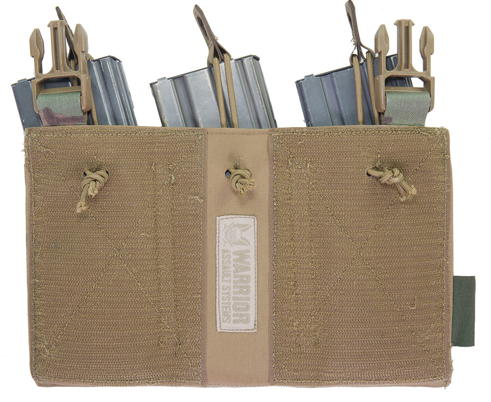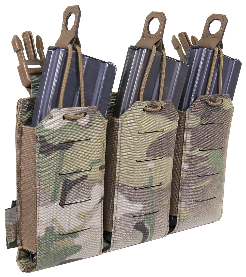 The Laser Cut Detachable Triple 5.56 Mag Pouch from Warrior Assault Systems is a detachable front panel triple 5.56 magazine pouch that attaches to the front of the LPC plate carrier with Velcro and 2 vertical SQM clips.