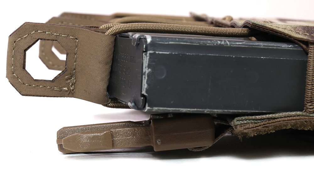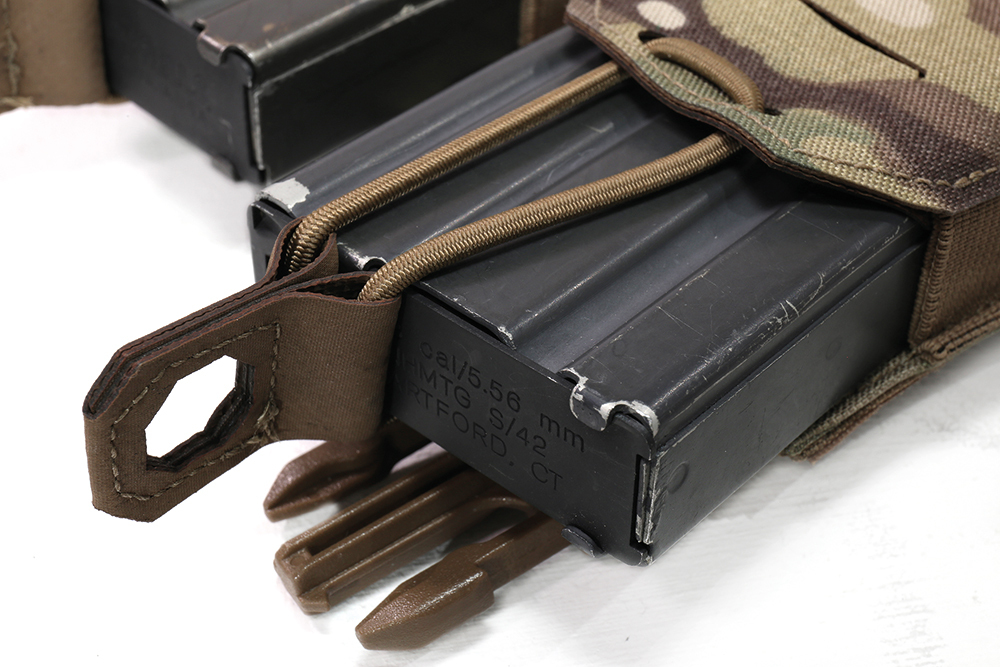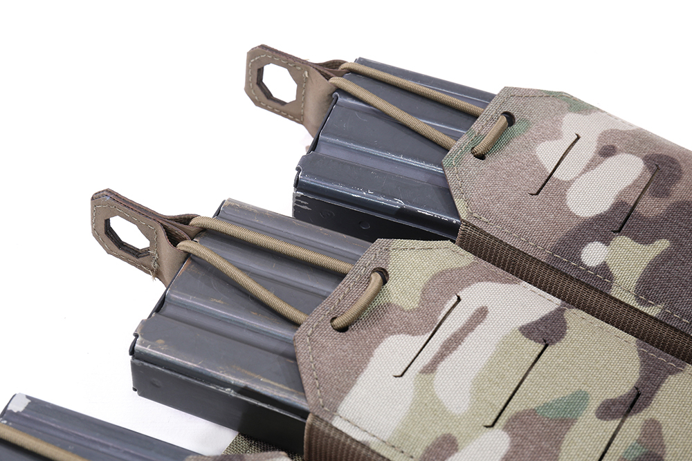 The Laser Cut Detachable Triple 5.56 Mag Pouch from Warrior Assault Systems is a detachable front panel triple 5.56 magazine pouch that attaches to the front of the LPC plate carrier with Velcro and 2 vertical SQM clips. The magazine pocket panel holds 3 5.56 mm x 45 mm magazines, which are held in place with elastic cord fasteners. The pockets are lined on the inside with anti-slip Hypalon material, which prevents the magazine from slipping when the elastic cord closure is removed. The magazine pouches each have 4 MOLLE slots on the outside to which additional pouches such as pistol magazine pouches, CAT holsters or multitool holsters can be attached. Suitable for all common 5.56 mm magazines, such as NATO STANAG 4179, AR-15/M4/M16 incl. PMAGs, Steyr AUG.