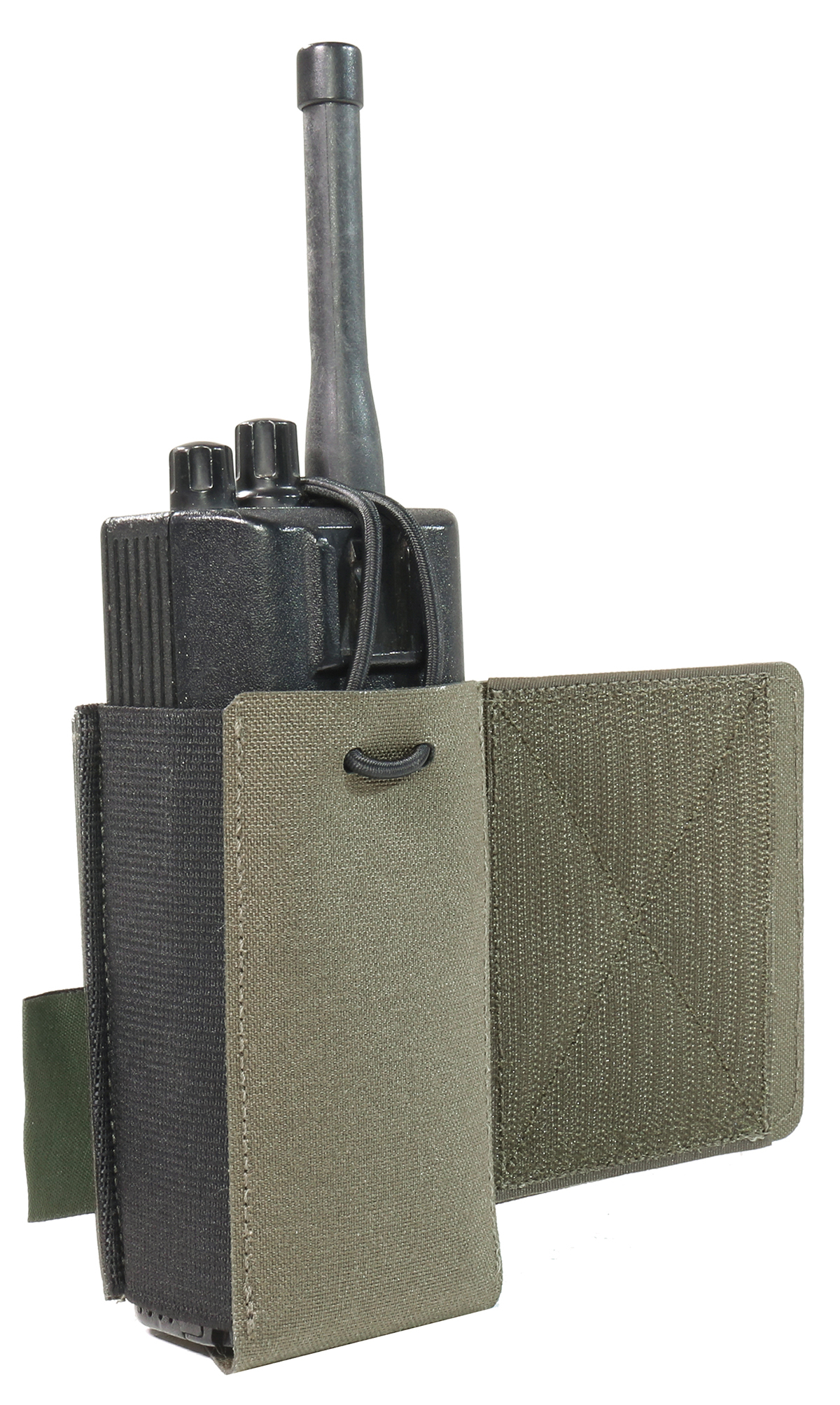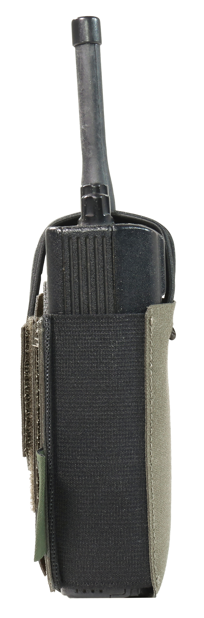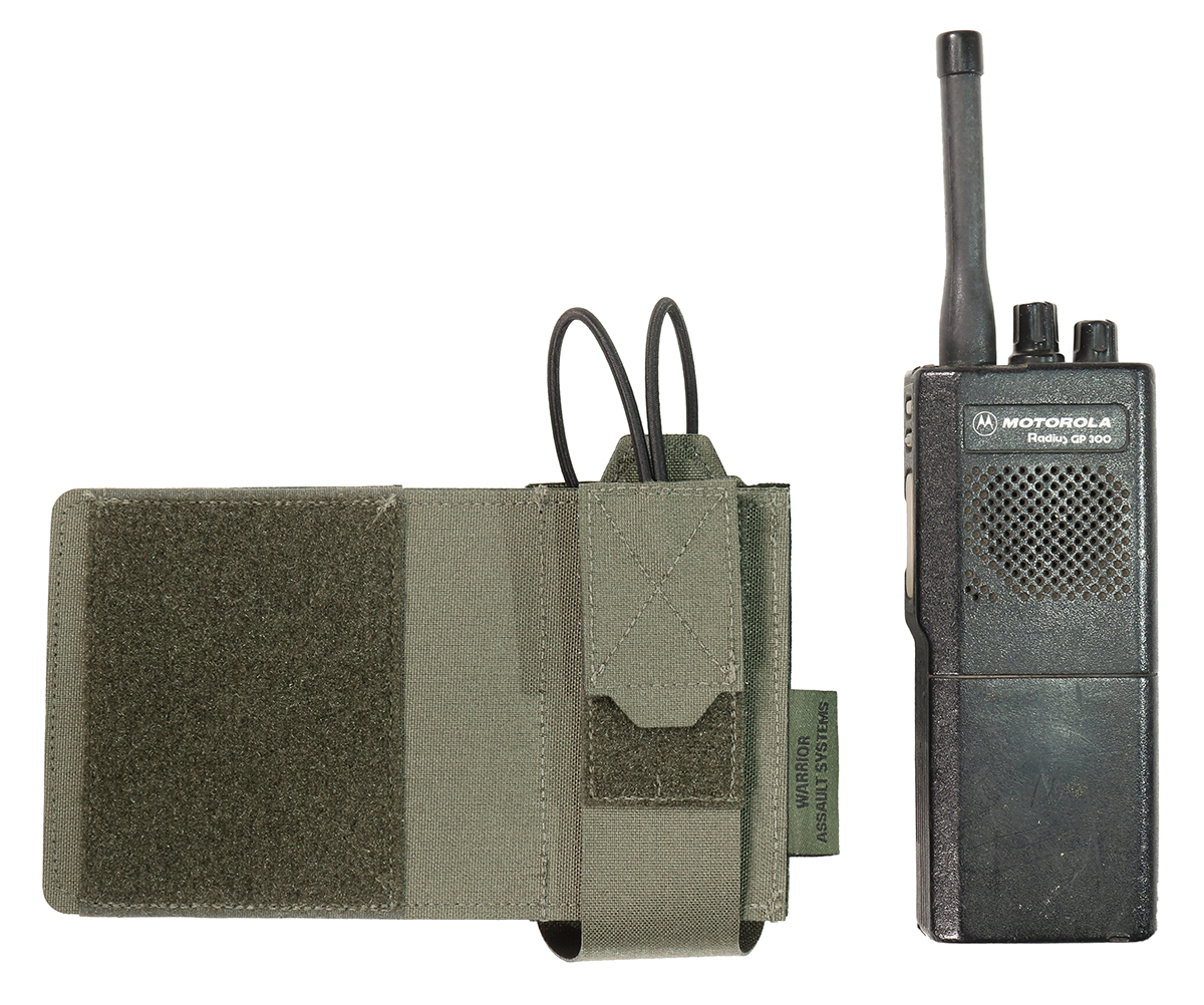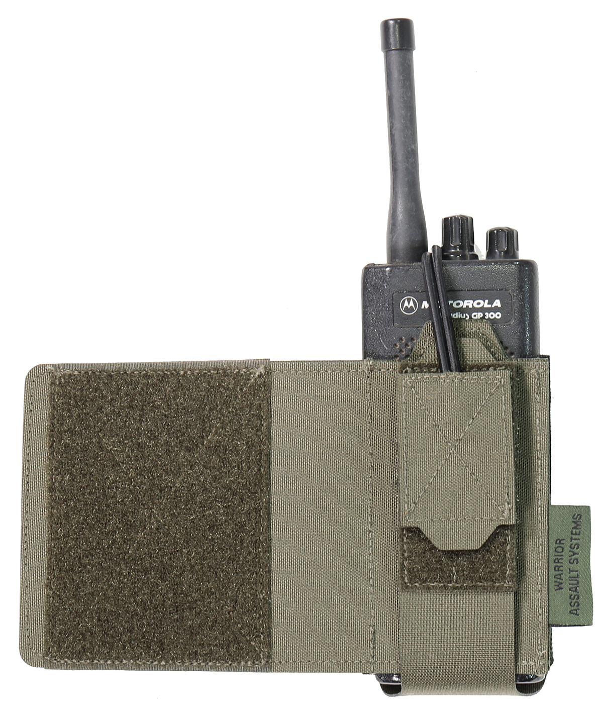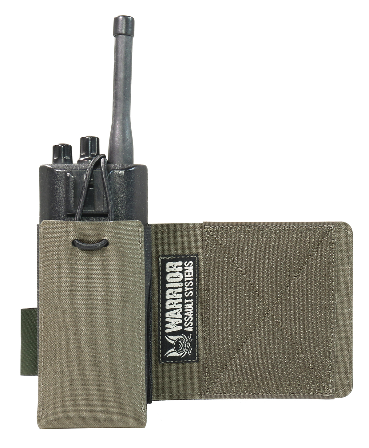The Laser Cut Winged Adjustable Radio Pouch (Links) from Warrior Assault Systems is a universal holster for small radios to attach to plate carriers. The side elastic straps provide compression and a secure hold for the radio. The pouch attaches to the Warrior plate carrier with Velcro under the front panel. The side cummerbund then closes over the pocket. The pouch and radio then fit tightly and securely against the left side of the user's body.