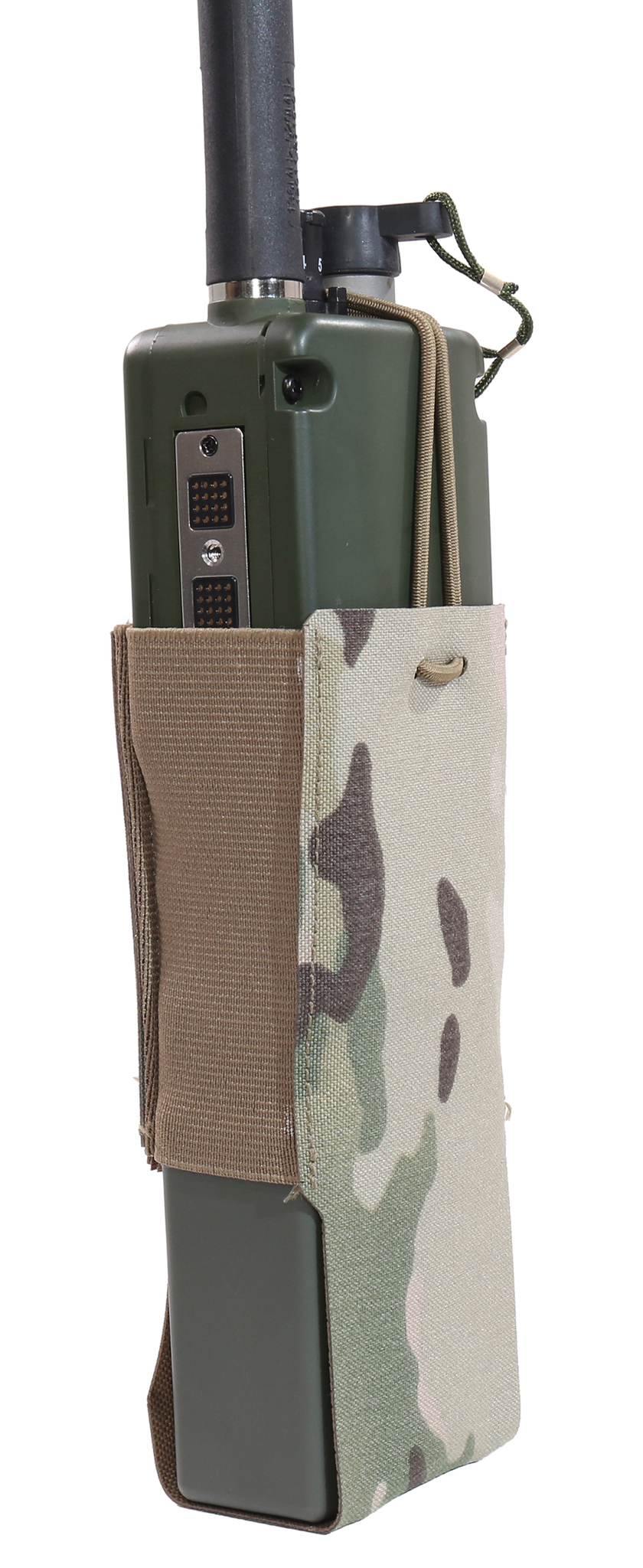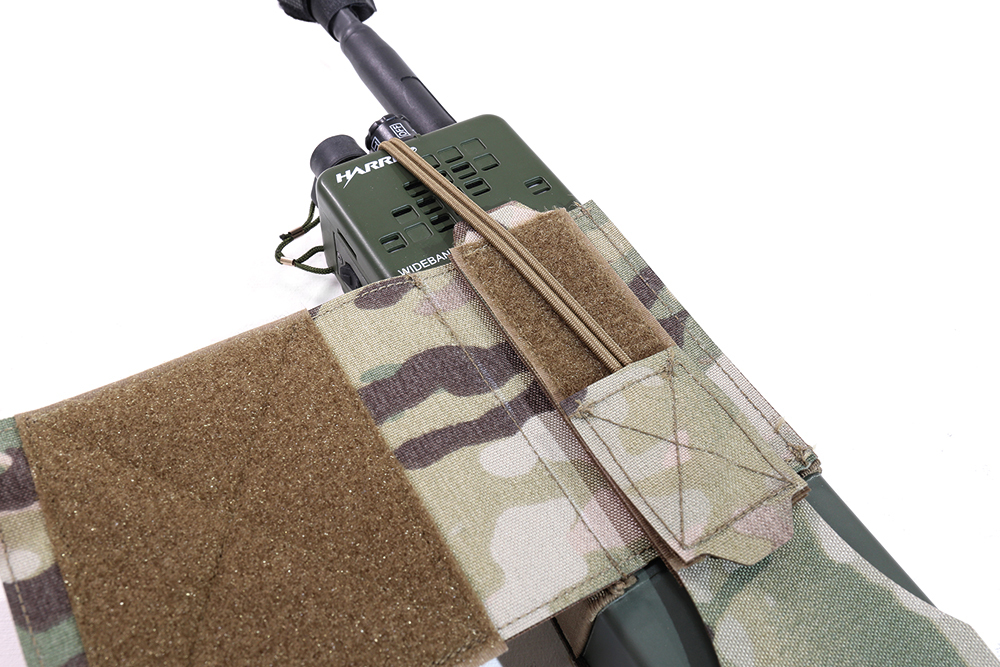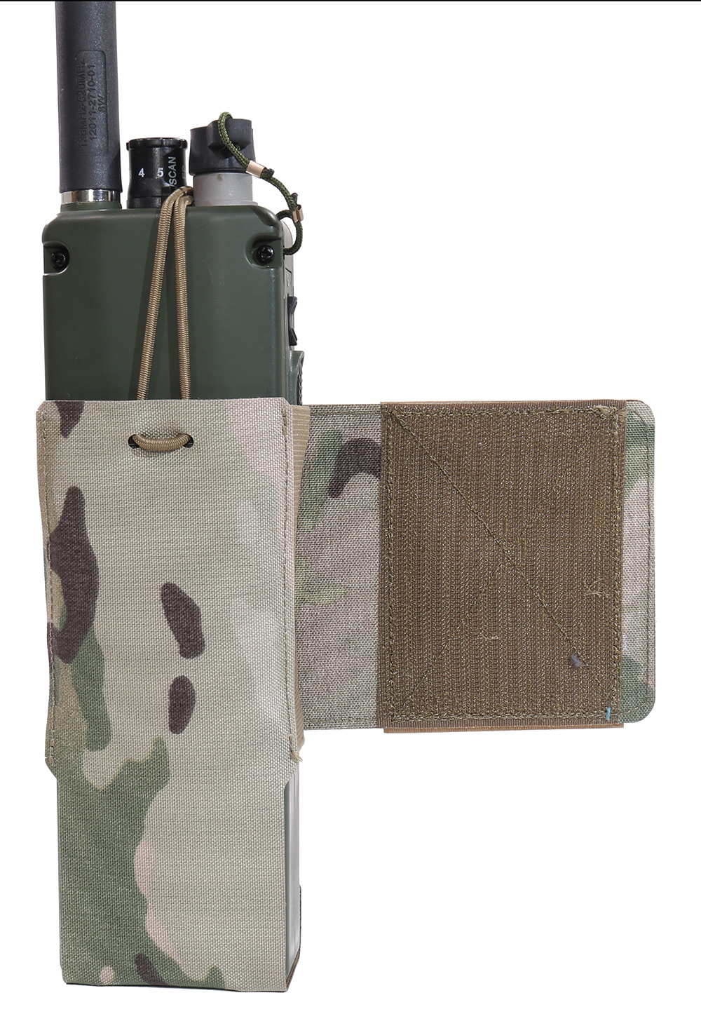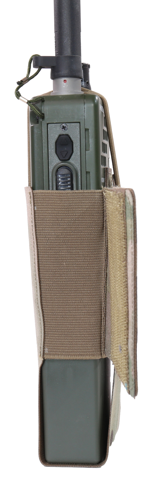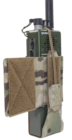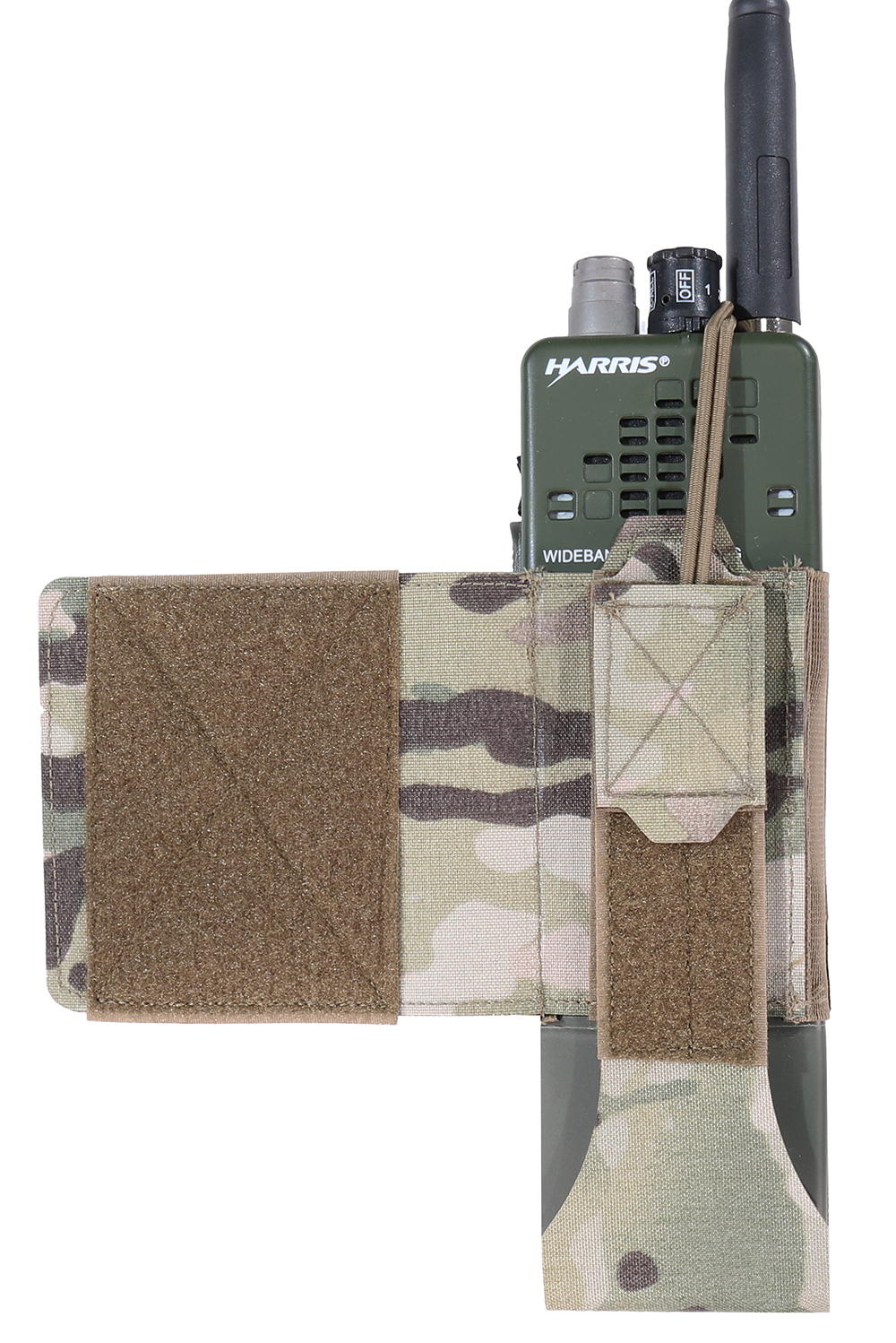 The Laser Cut Winged MBTIR Radio Pouch (Links) from Warrior Assault Systems can accommodate both the MBITR 148 and Harris PRC 152 radios. The side elastic bands provide compression and a secure hold for the radio. The bag attaches to the Warrior plate carrier with Velcro under the front panel. The side cummerbund then closes over the pocket. The pouch and radio then fit tightly and securely against the left side of the user's body.