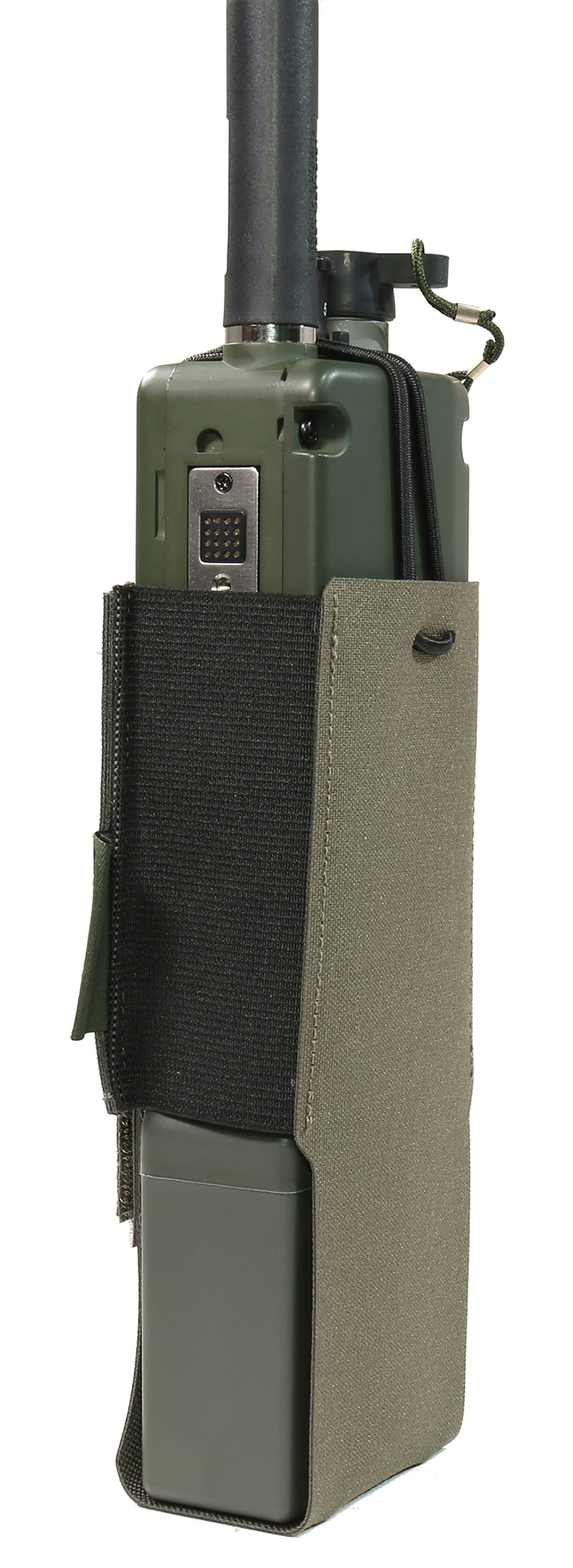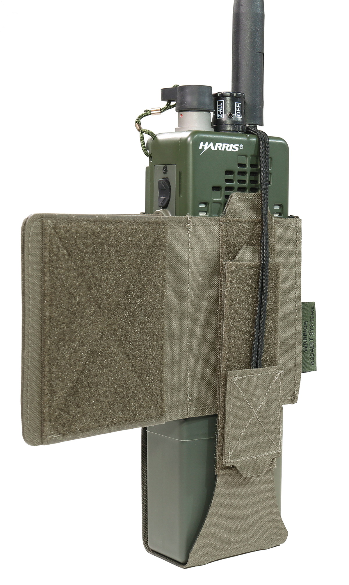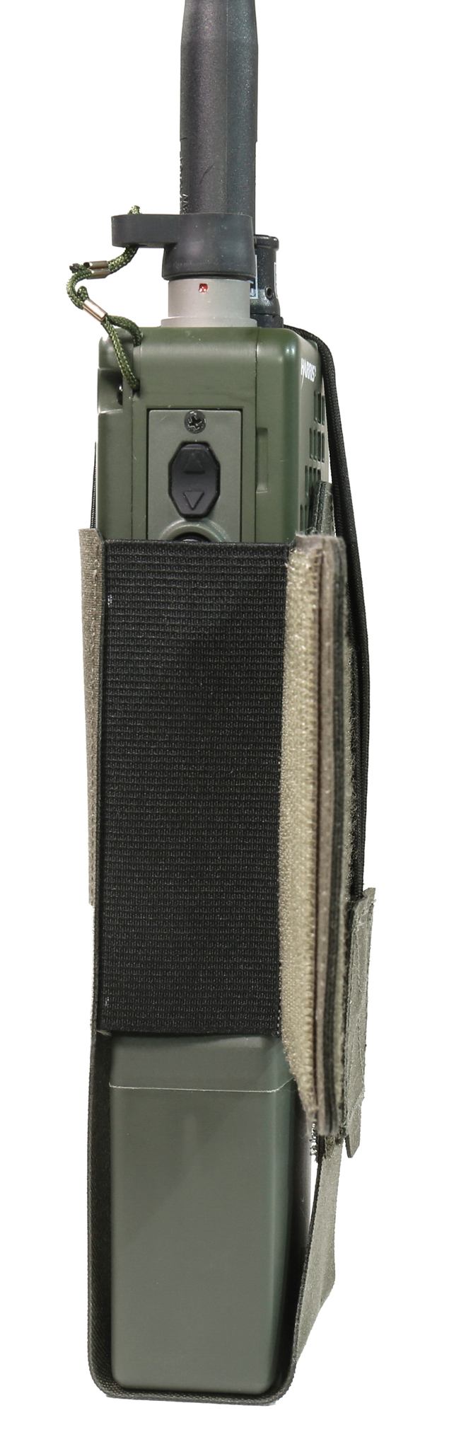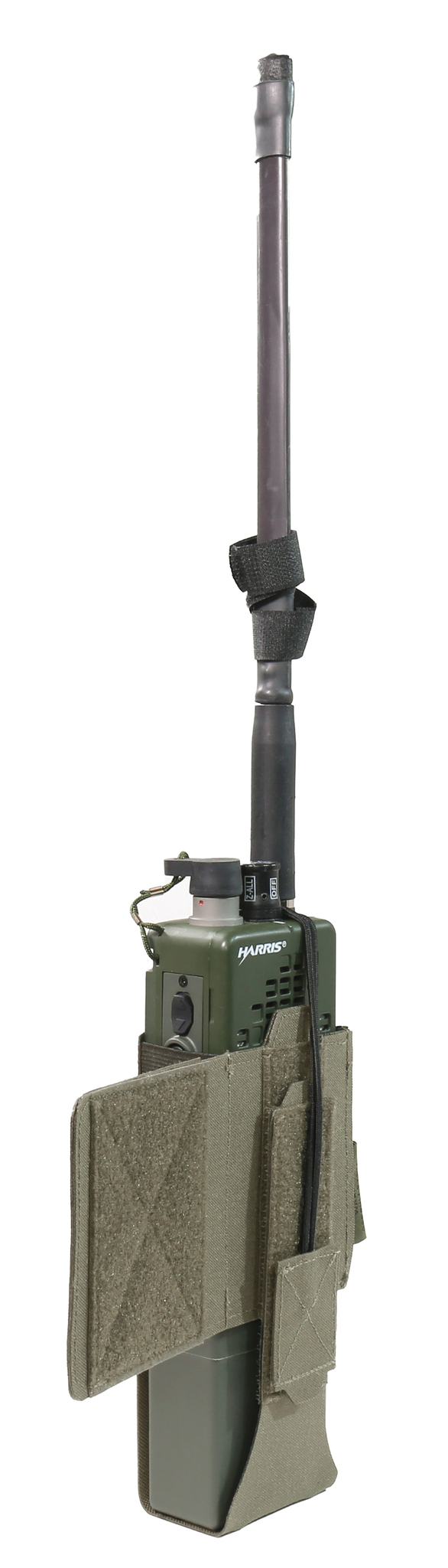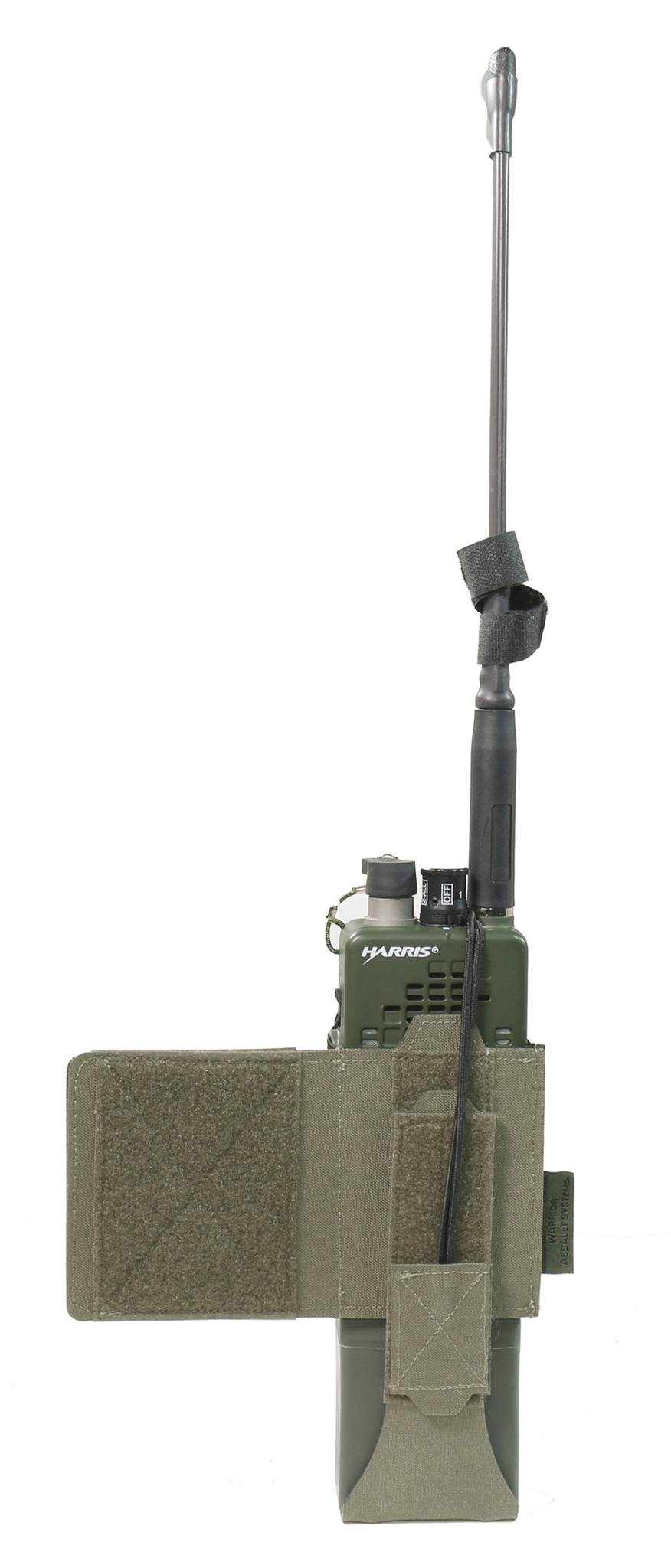 The Laser Cut Winged MBTIR Radio Pouch (Links) from Warrior Assault Systems can accommodate both the MBITR 148 and Harris PRC 152 radios. The side elastic bands provide compression and a secure hold for the radio. The bag attaches to the Warrior plate carrier with Velcro under the front panel. The side cummerbund then closes over the pocket. The pouch and radio then fit tightly and securely against the left side of the user's body.