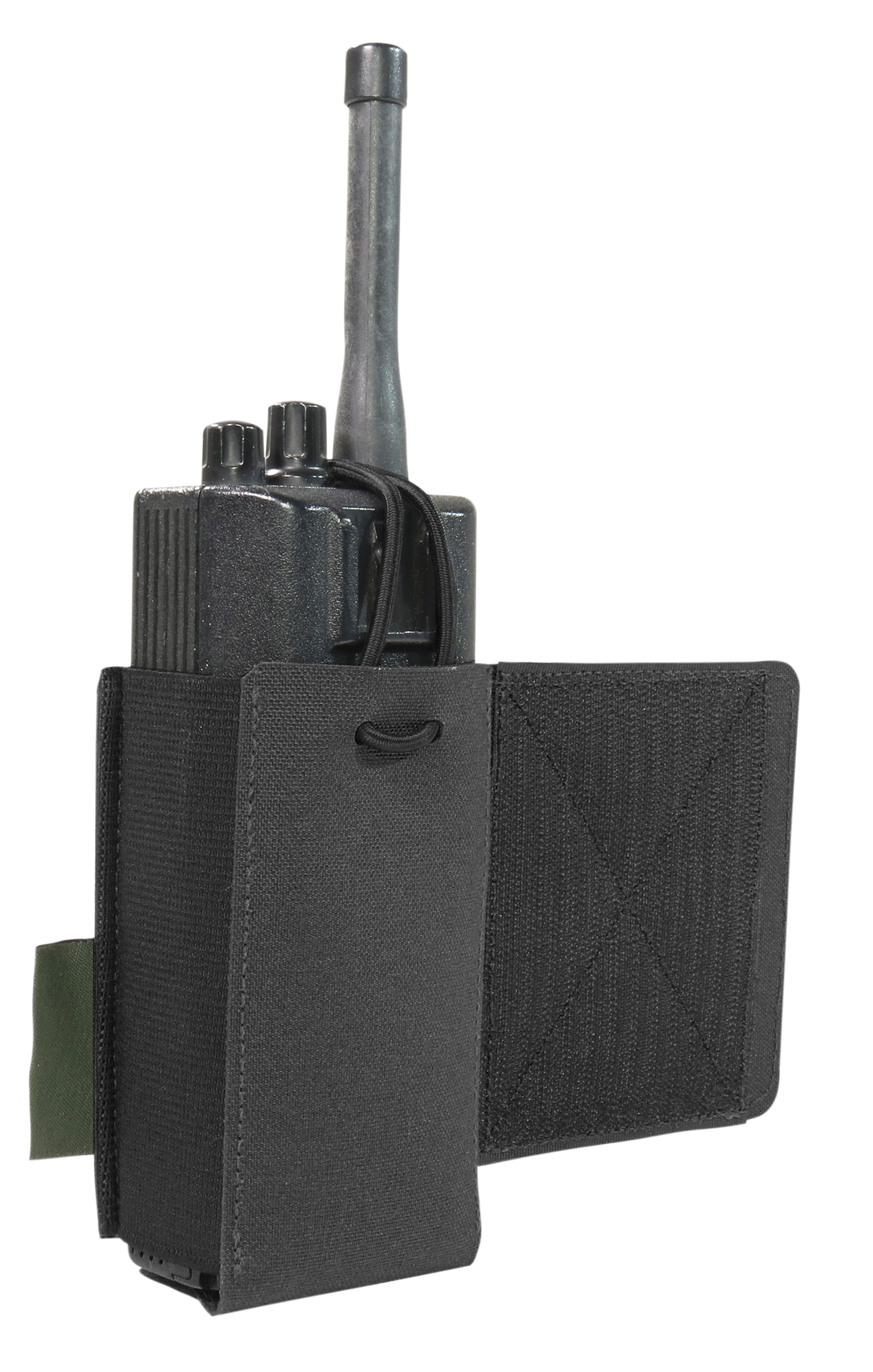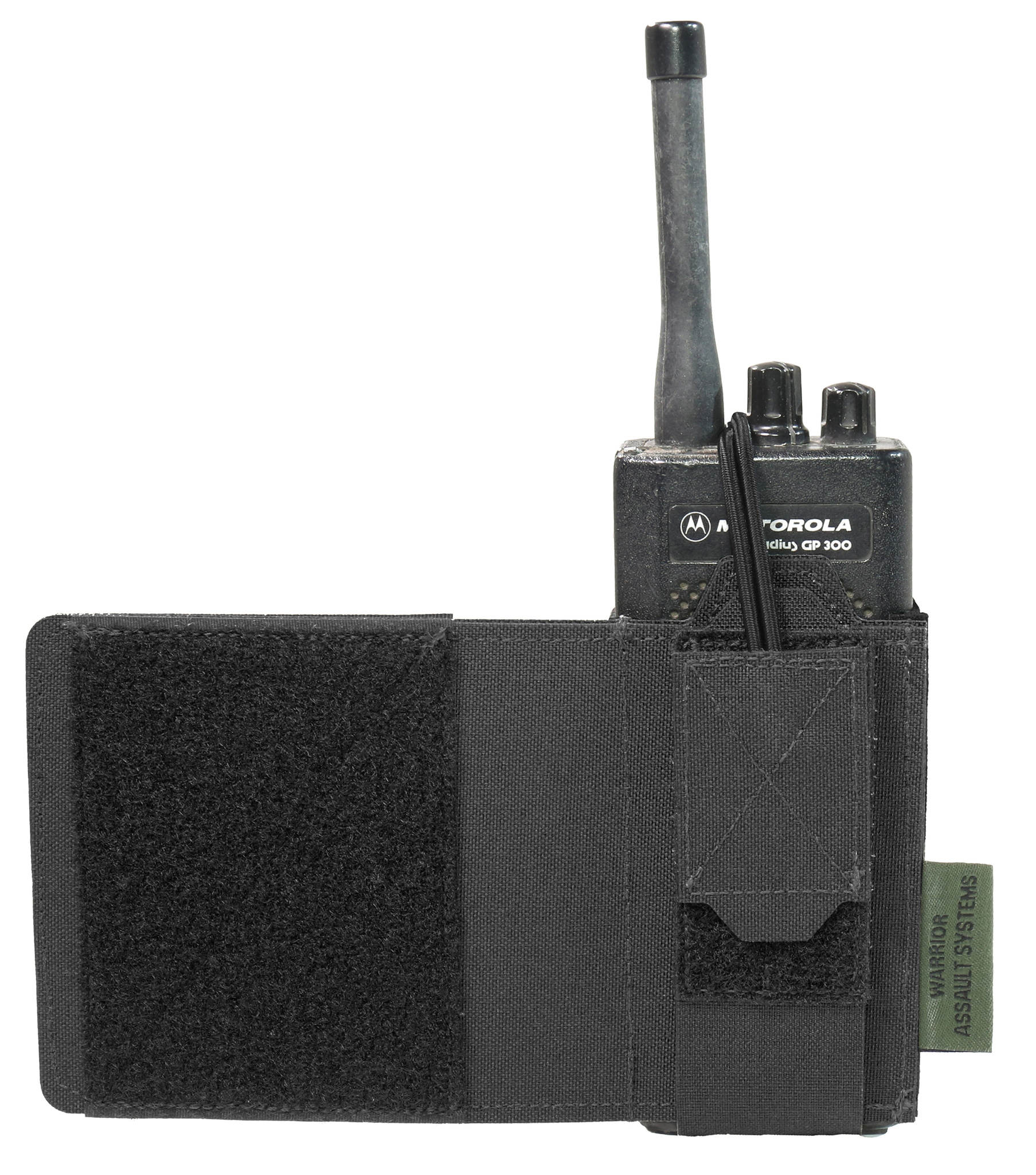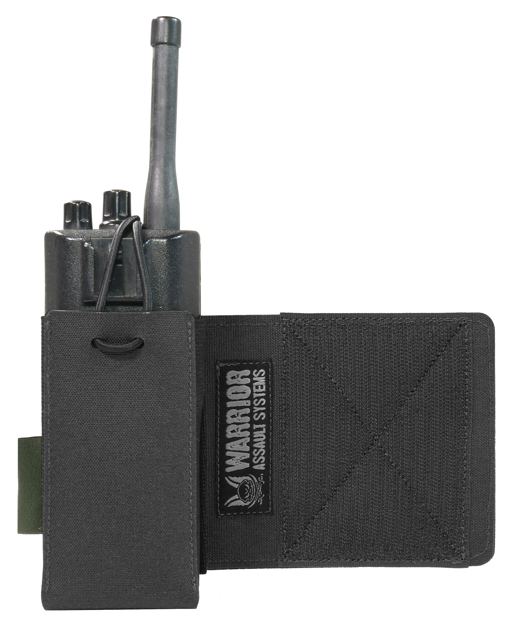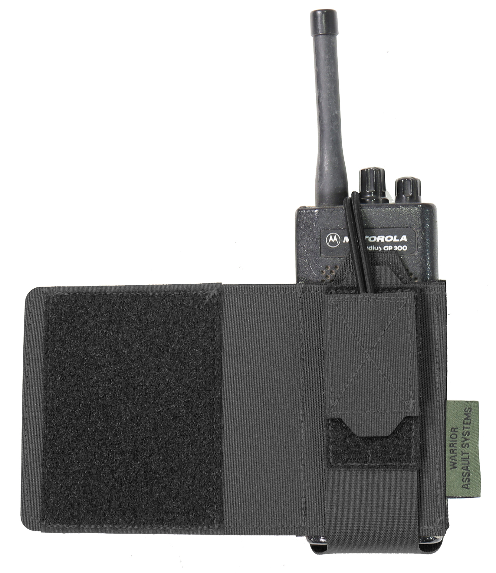 The Laser Cut Winged MBTIR Radio Pouch (Links) from Warrior Assault Systems can accommodate both the MBITR 148 and Harris PRC 152 radios. The side elastic bands provide compression and a secure hold for the radio. The bag attaches to the Warrior plate carrier with Velcro under the front panel. The side cummerbund then closes over the pocket. The pouch and radio then fit tightly and securely against the left side of the user's body.