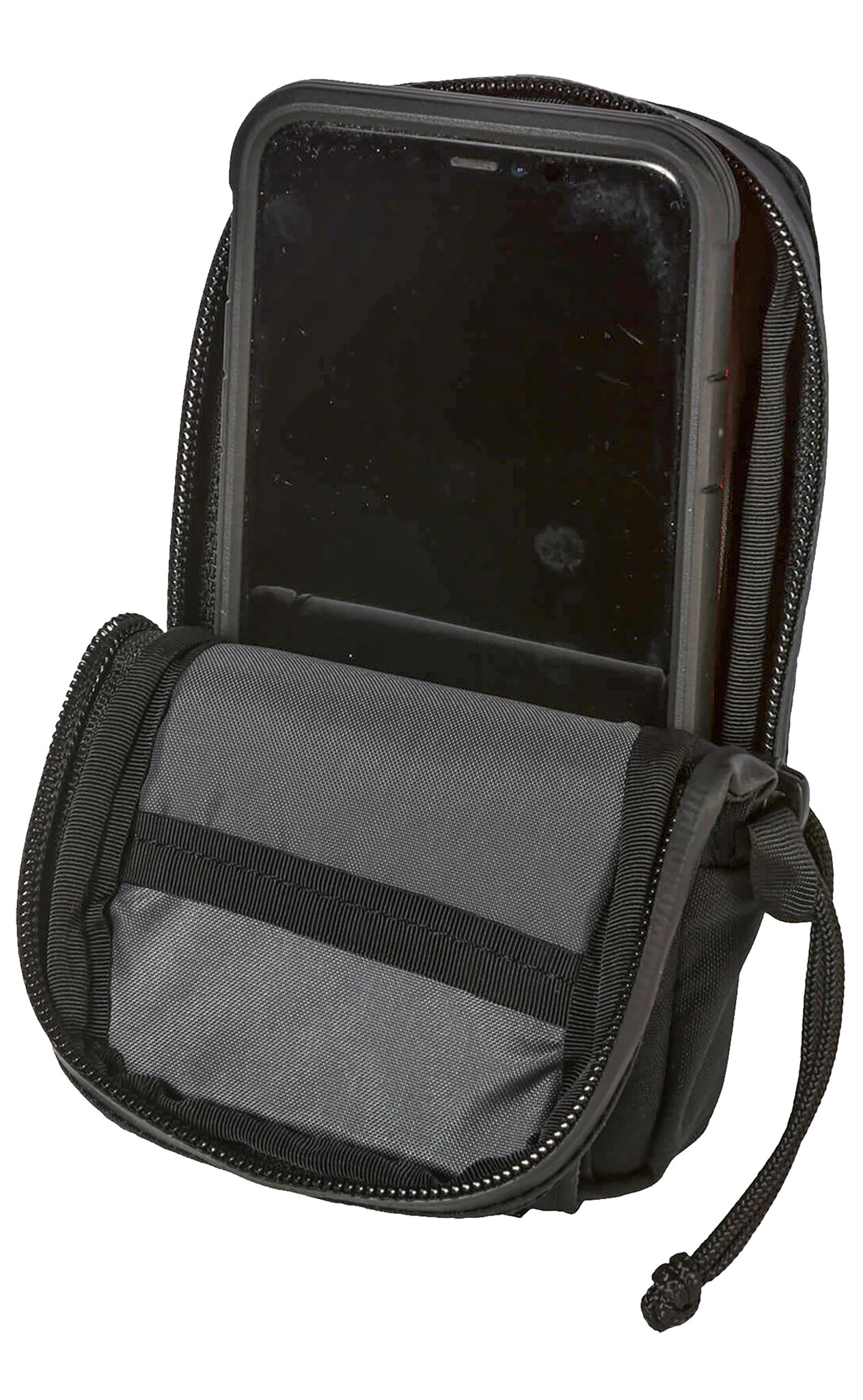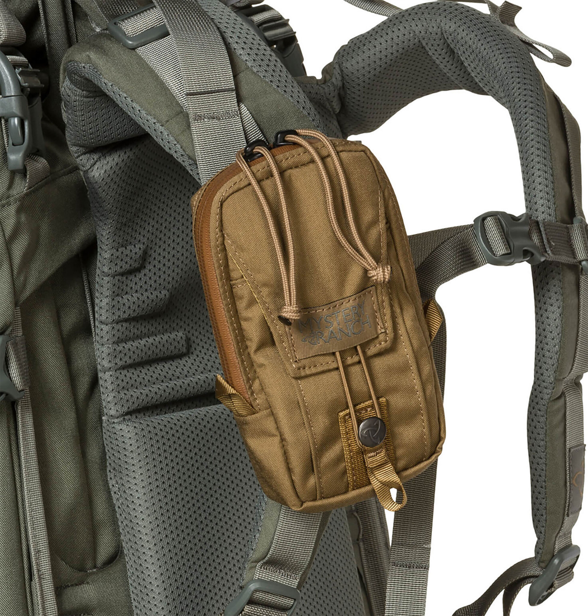 When you're out in nature, you want your electronic devices, whether cell phone or GPS, to be protected. The Mistery Ranch Tech Holster features a weatherproof zipper at the top of the main compartment. Inside the main compartment, you'll find another pocket that's great for storing cables. The holster is made of durable 500D Cordura. The front pocket of the Tech Holter can be closed with an elastic band. Securing the backpack is made easy with multiple MOLLE options to a PALS webbing, shoulder pad, bino strap or belt.