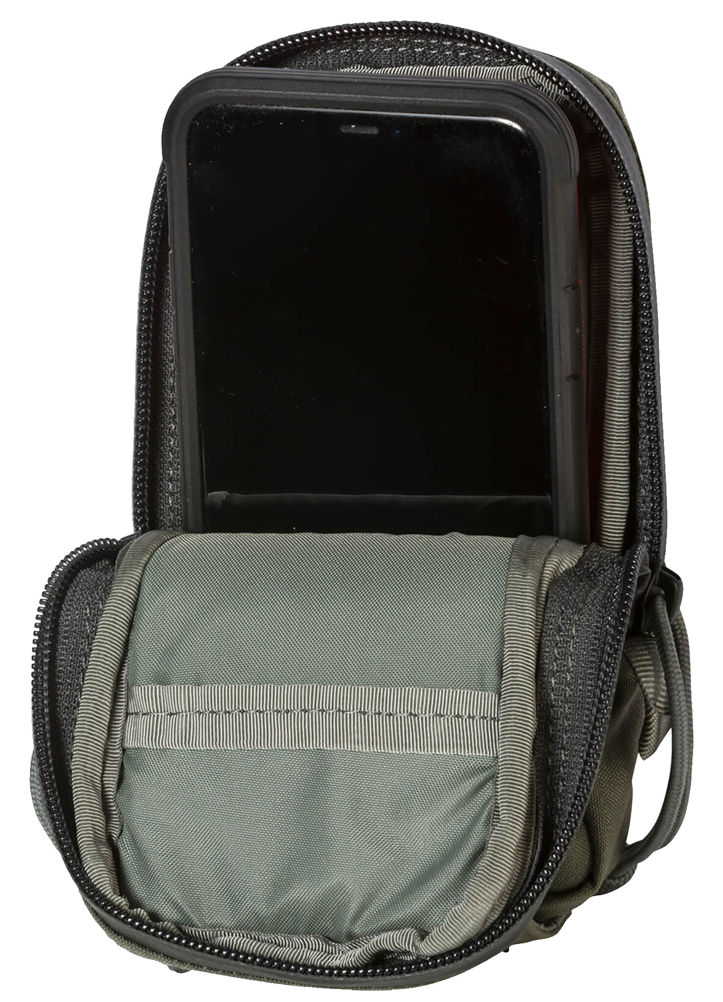 When you're out in nature, you want your electronic devices, whether cell phone or GPS, to be protected. The Mistery Ranch Tech Holster features a weatherproof zipper at the top of the main compartment. Inside the main compartment, you'll find another pocket that's great for storing cables. The holster is made of durable 500D Cordura. The front pocket of the Tech Holter can be closed with an elastic band. Securing the backpack is made easy with multiple MOLLE options to a PALS webbing, shoulder pad, bino strap or belt.