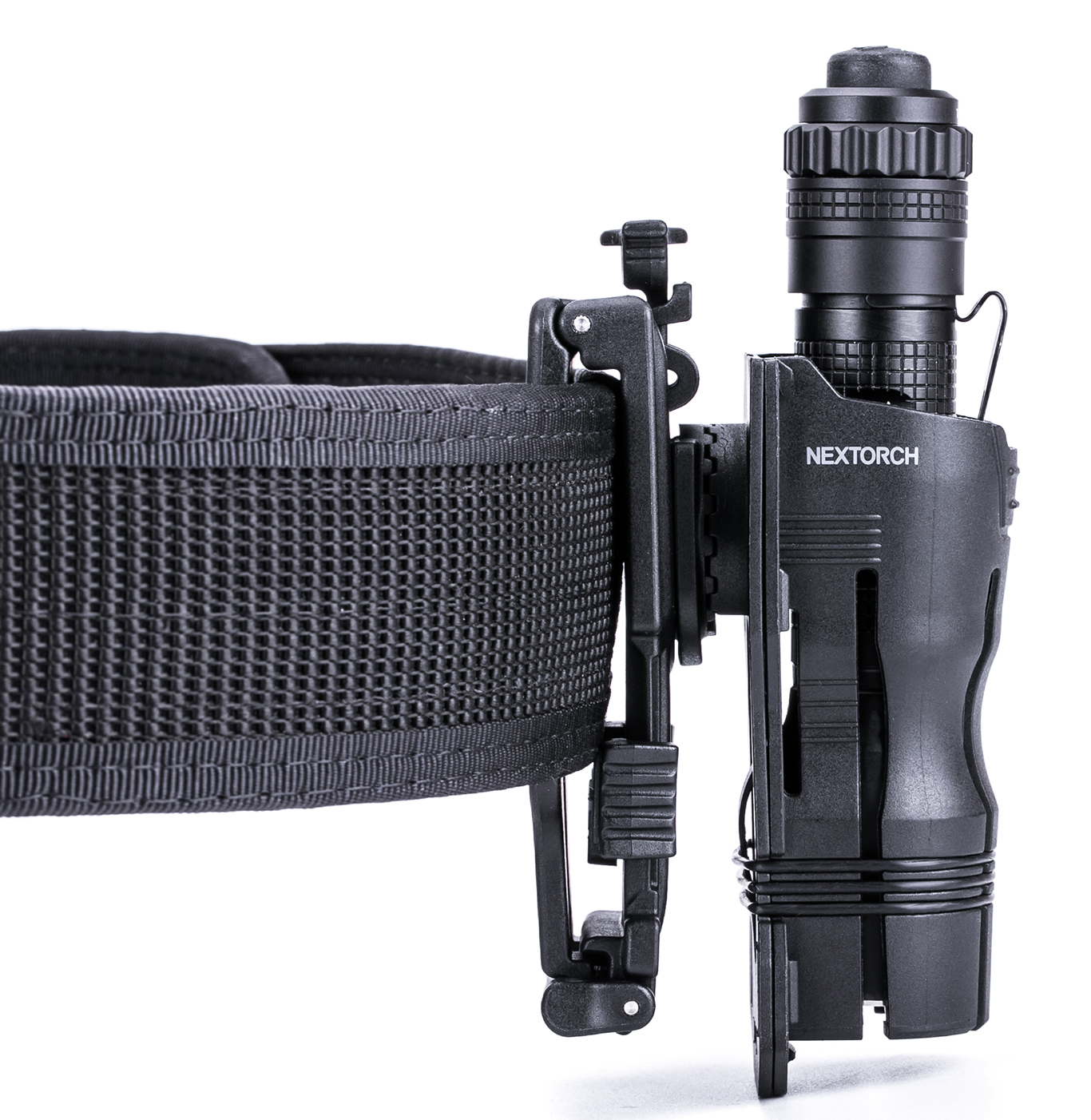 The V61 flashlight holster from Nextorch has three O-rings with which the strength of the holster can be adjusted. Removing one or two O-rings reduces the strength. This allows larger flashlights to fit in perfectly, for example. The Nextorch V61 holster fits flashlights with a head/tail diameter of 27 - 30 mm. A mechanism allows the flashlight holder to rotate 360° and lock in 16 positions. The MOLLE compatible belt mount fits belts up to 55 mm wide.