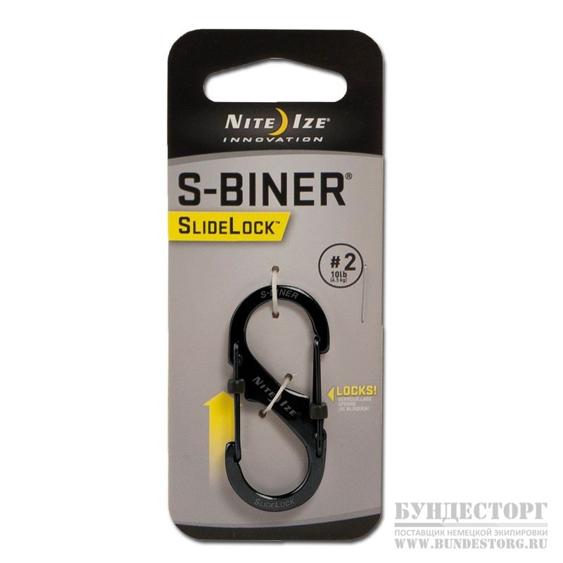 Карабин S-Biner со двойным скользящим замком. С каждой стороны имеется по 2 пластмассовых ползунка, которые предотвращают непреднамеренное открытие.