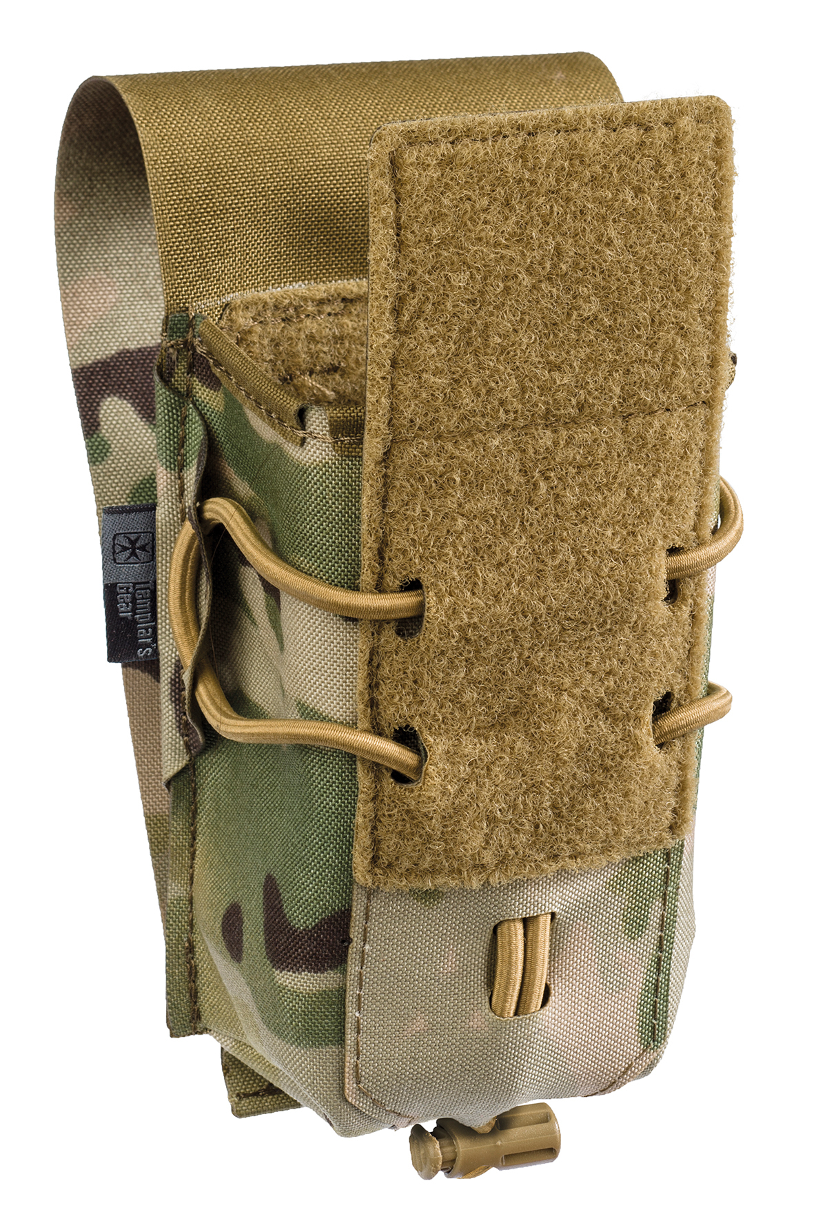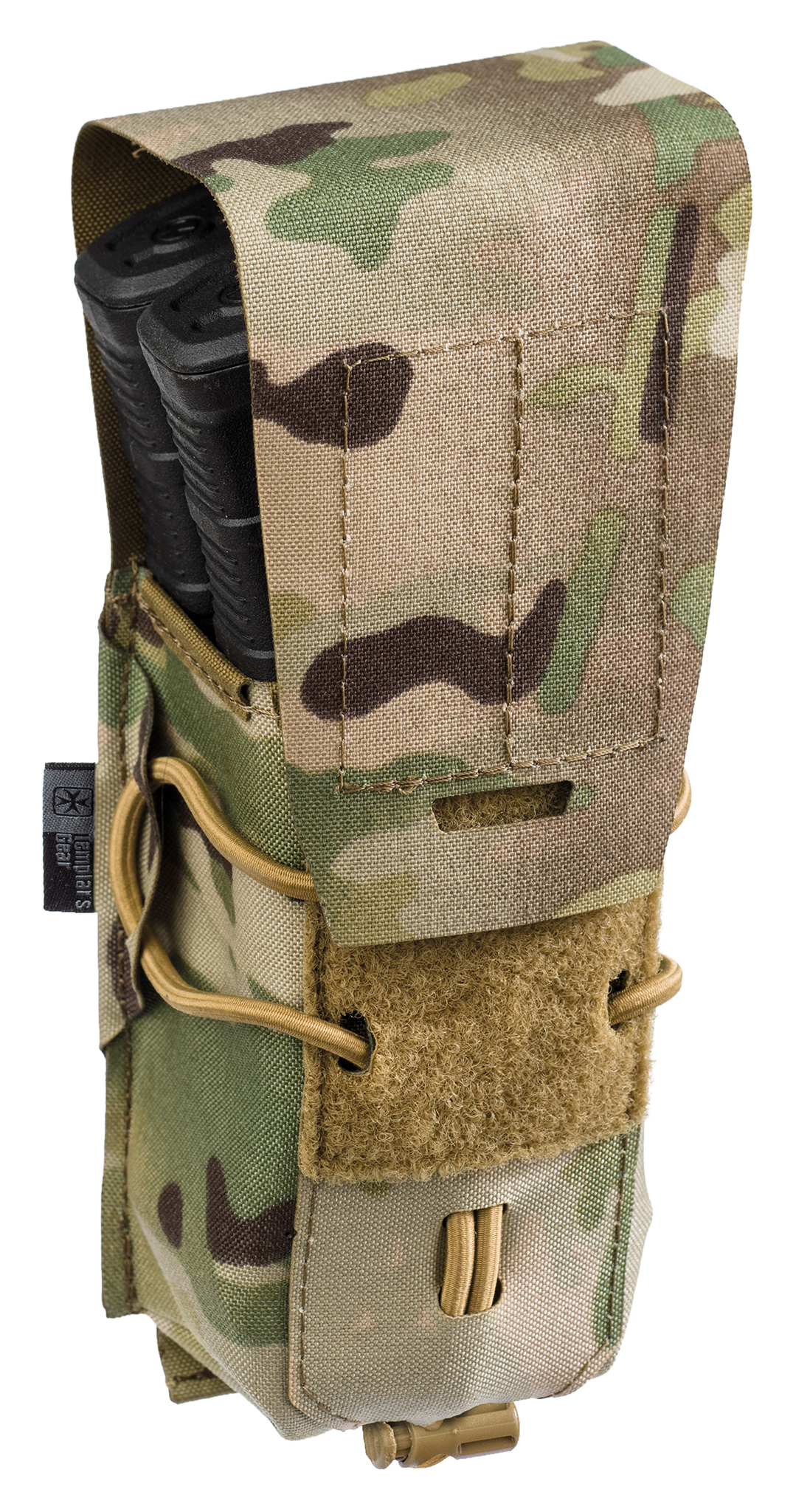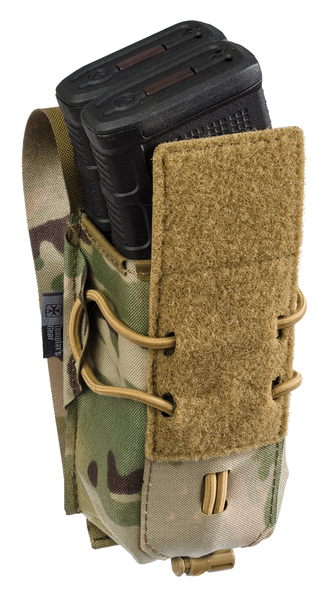 Templars Gear's Double Mag Pouch magazine pouches are extremely low-profile, lightweight and made of rugged 500D Cordura® laminate. Magazines are secured by a closure tab with Velcro and by a half-round bungee cord with cord stopper. The closure tab can be velcroed away so the pouch can also be used open.