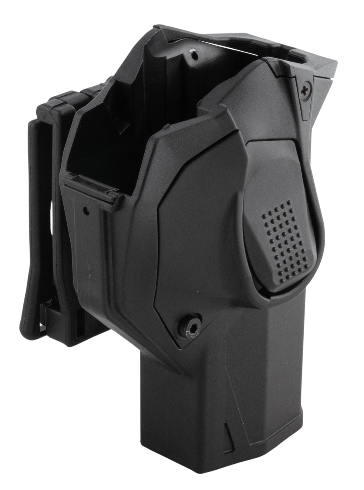 The Vega Concealment Cama is a professional, injection molded holster with two levels of security. The safety is released by simply dragging the index finger along the release in the draw cycle. Easy handling is possible even when wearing gloves. A passive safety system, consisting of an adjustable retaining screw that acts directly on the holster body, avoids internal movement of the weapon. Possibility of inserting a front guard for greater weapon safety. The belt clip is adjustable in inclination and height.