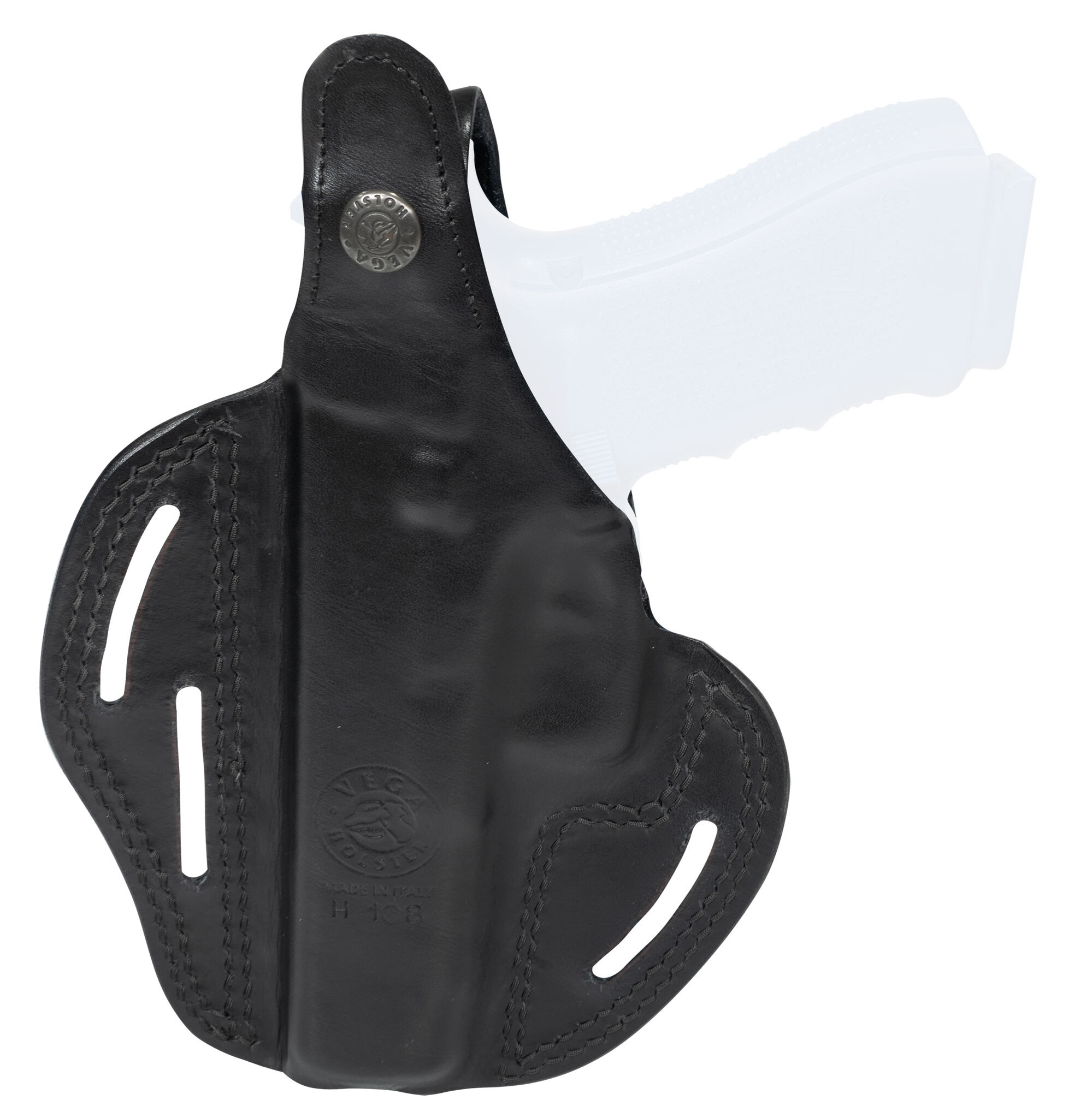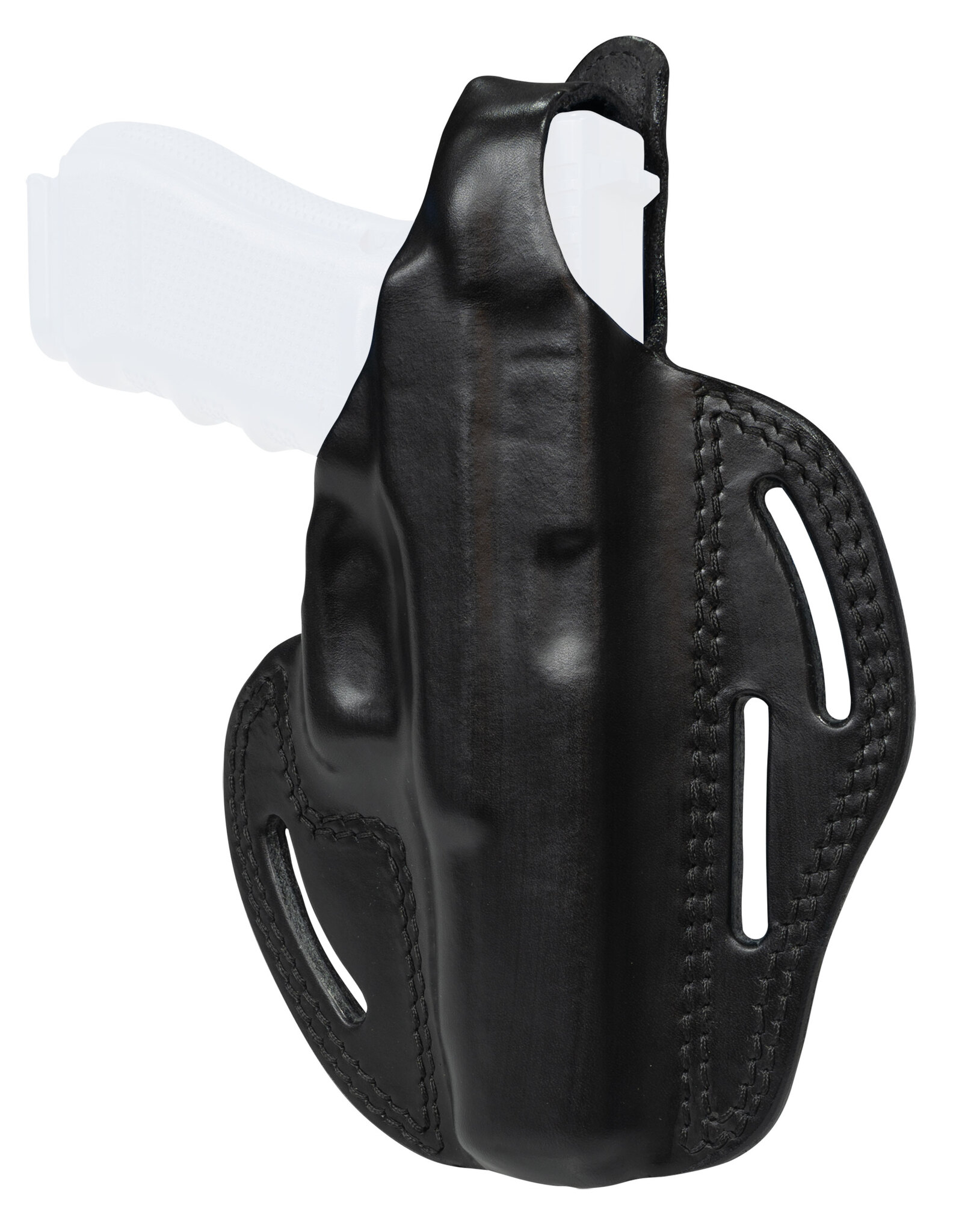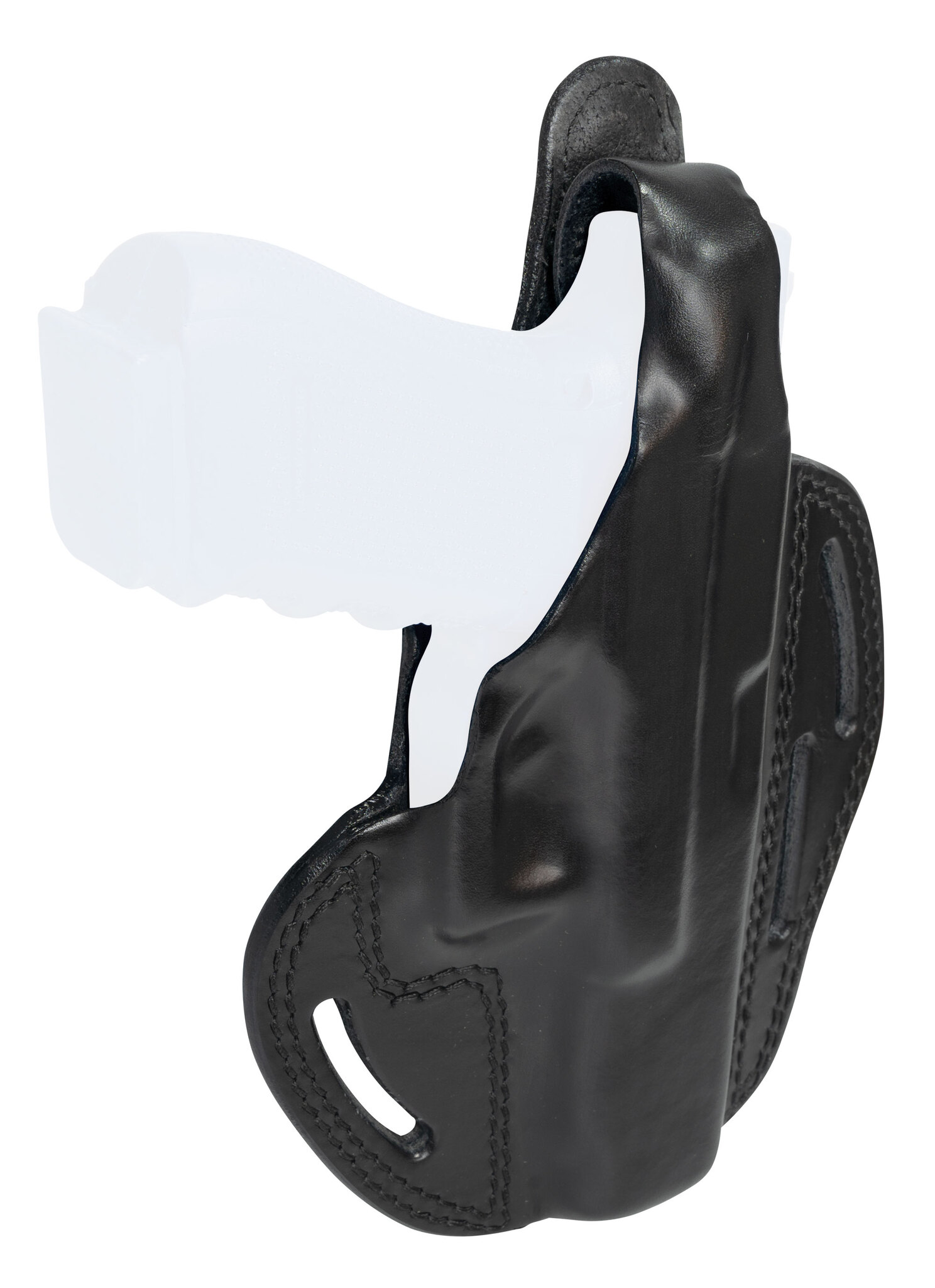 The shape of the gun is pressed into the leather to ensure a precise fit. The holster covers the weapon from trigger guard to muzzle and is open at the bottom. The front sight is concealed, The weapon is secured by a standard "Thumb Break Closure". Draw angle is selectable through two belt passages. Fits belts up to 45 mm wide.