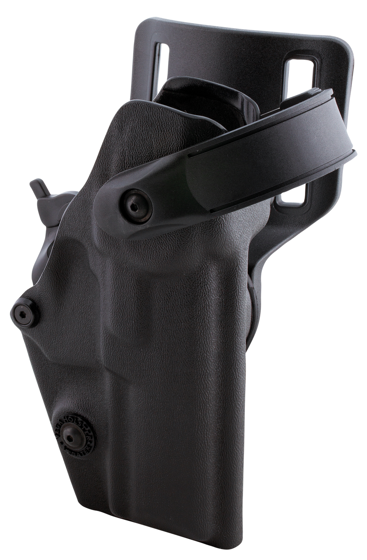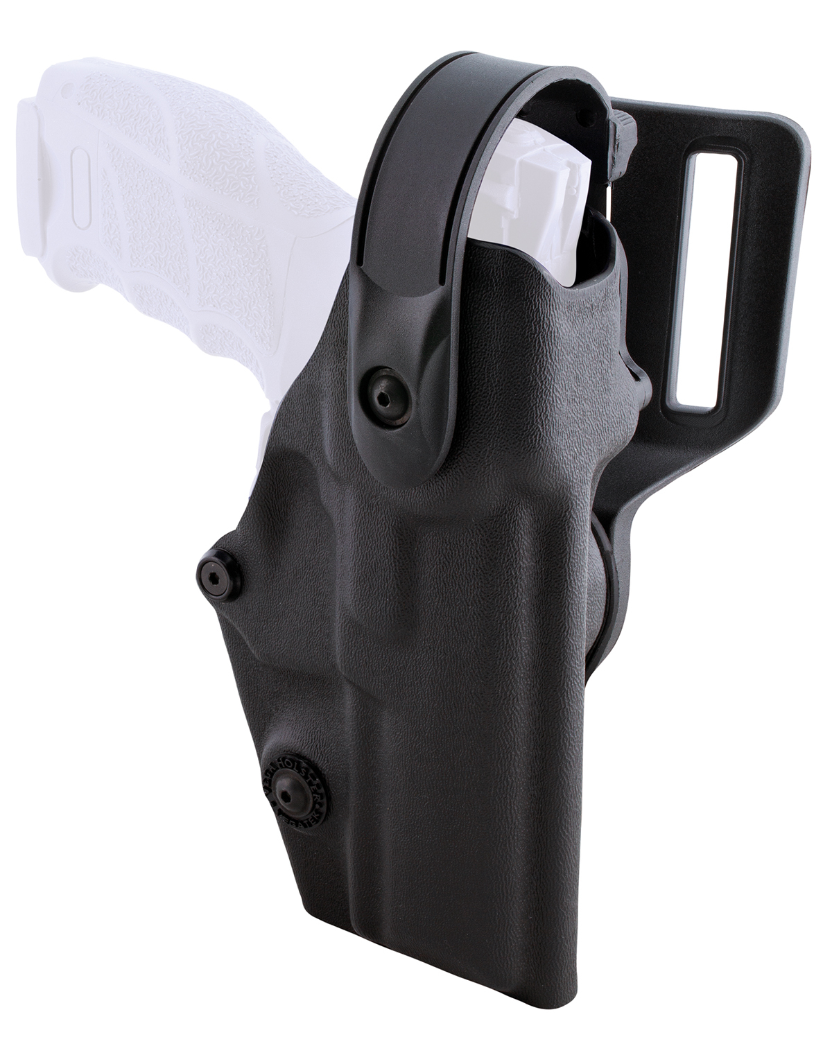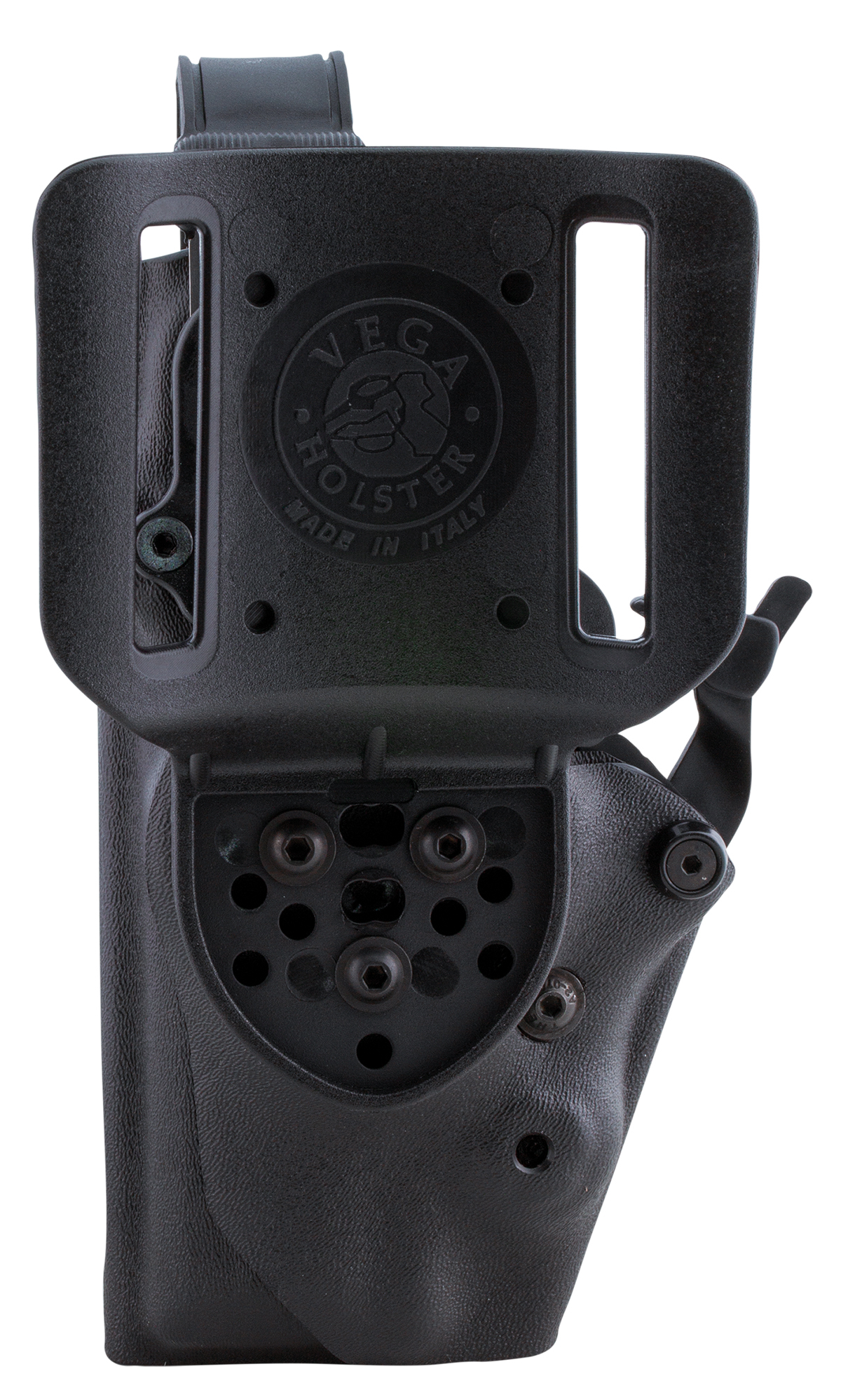 The Vega Level 4 Duty Holster is a professional duty holster made of thermoformed polymer with four safety levels. The safety stages consist firstly of a high resistance safety bar made of injected polymer, which is released by a spring device with the thumb. The second safety level is the Vega Pull Side, which is automatically activated when the weapon is inserted into the holster and released simply and naturally with a flick of the wrist. This safety can be additionally secured by a bolt (third safety level) to increase safety. The fourth level of security is a passive security system consisting of an adjustable retaining screw that acts directly on the holster body to prevent internal movement of the weapon. The holster bar can be adjusted for different draw angles and is suitable for duty belts up to 55 mm wide.