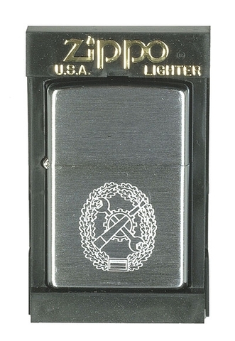 Silver colored Zippo gasoline lighter with detailed engraving of the Bundeswehr beret badge repair.