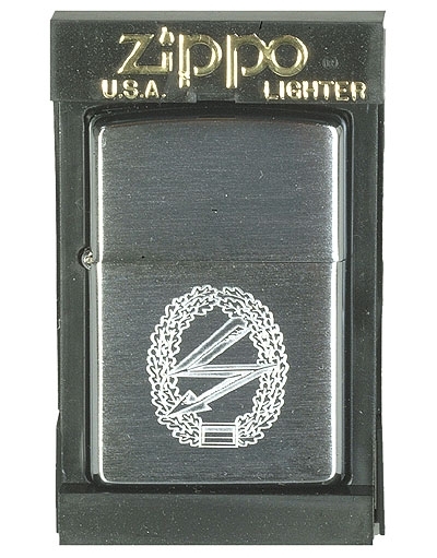 Silver colored Zippo gasoline lighter with detailed engraving of the Bundeswehr beret badge Fernmeldetruppe.