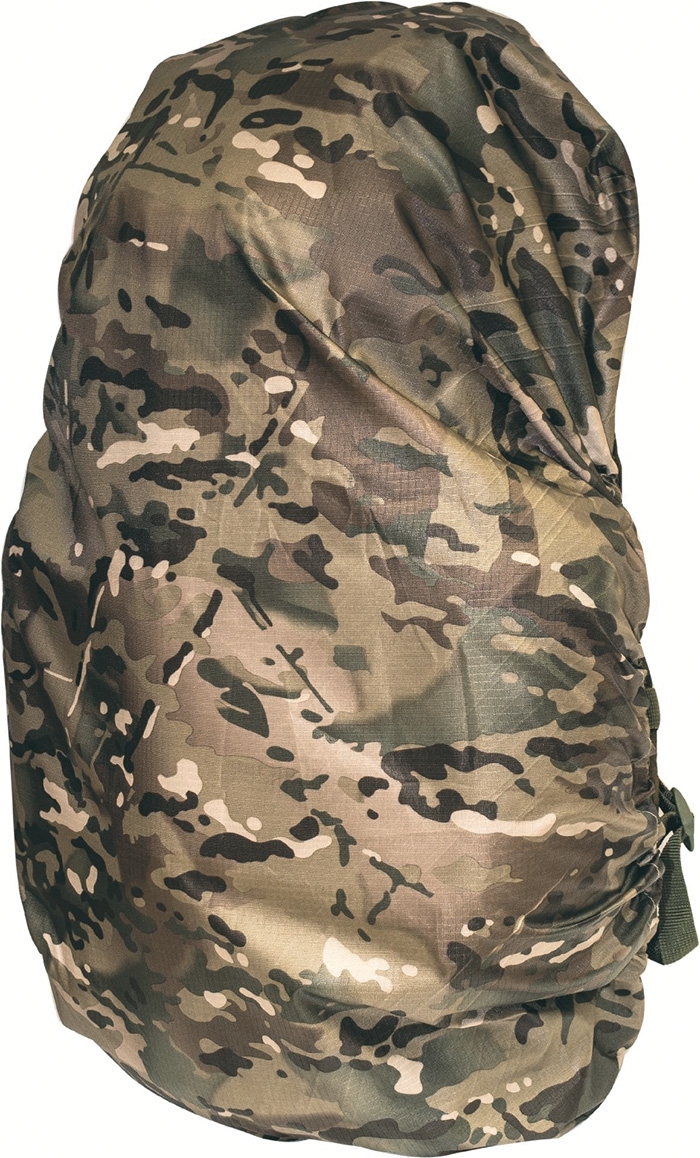 Lightweight backpack or bag cover in HMTC camo (Highlander Multi Terrain Camo) made of 210D polyester with water-repellent PU coating (water column approx. 3,000 mm) for backpacks.