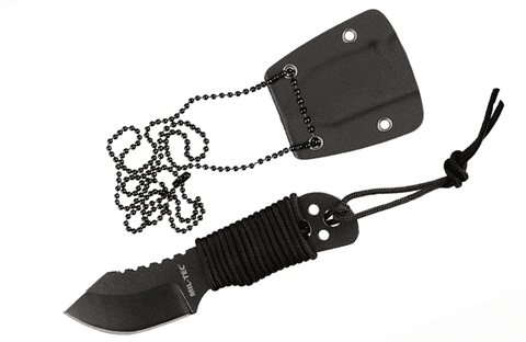 Small and very flat Kneck Knife with Kydex sheath and with ball chain to hang around. At the bottom of the handle is a loop to quickly pull out the knife.