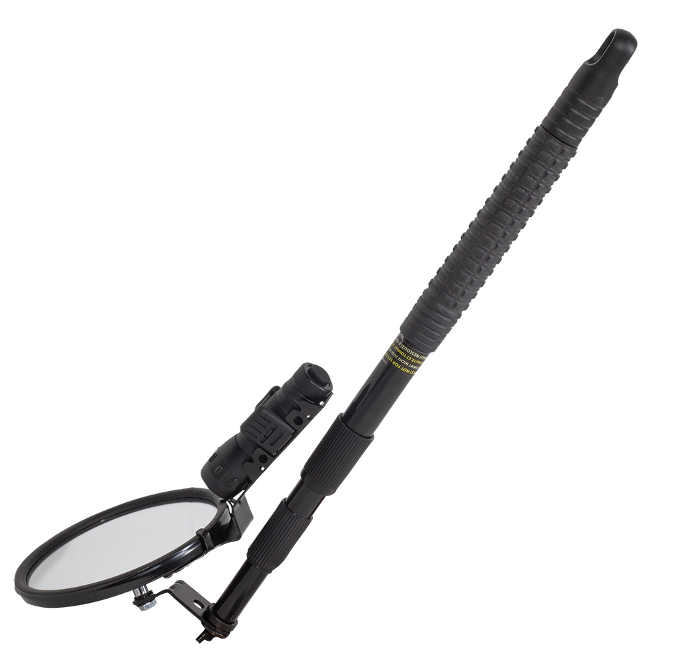 The telescopic inspection mirror is used for inspecting hazardous areas, searching for explosives or customs inspections. The advantage is the curved shape of the parabolic mirror, which provides a wide viewing angle into the space to be explored. The mirror is mounted on a telescopic rod via a joint and therefore the angle of view can be conveniently adjusted. The telescopic rod made of duralumin offers continuous length adjustment from 50 cm to 105 cm and folding to compact dimensions. The anti-slip handle allows a secure grip. The mirror is easily disassembled from the pole for better deposition during transport.
