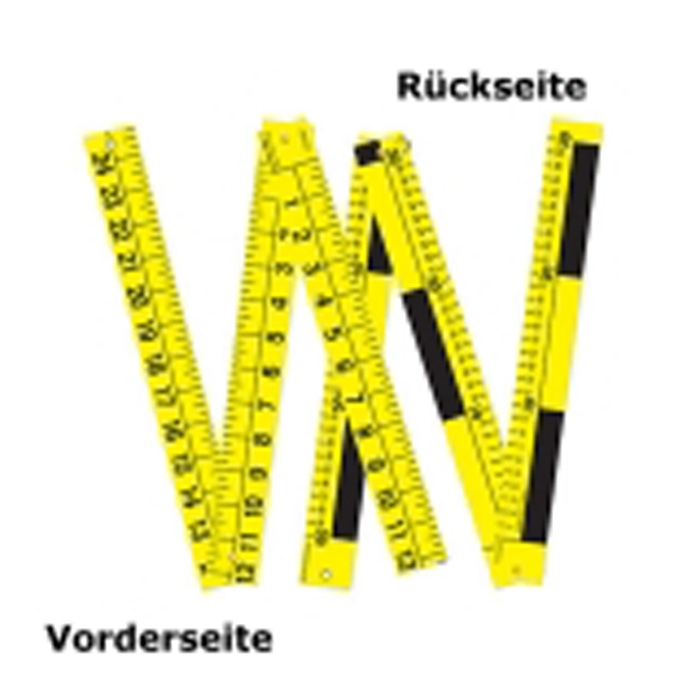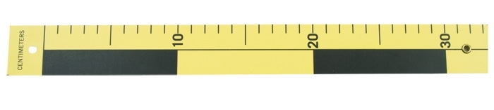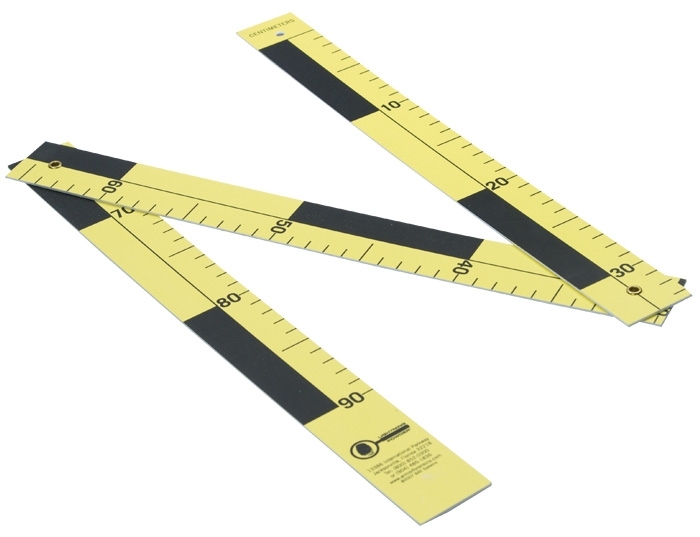 On one side measurements in cm and on the other side alternating black and yellow markings about 3 cm long.
