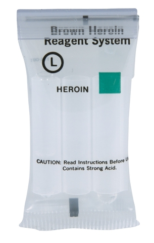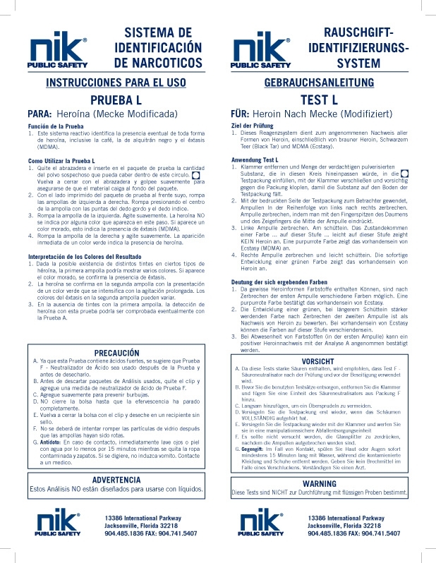 NIK® Drug Substance Test to identify Heroin, White/Brown/Black Tar, and MDMA Ecstacy, as well as the presence of various combinations of staining agents which could cause false positives on Test A. Used after positive test results from tests A B K U.