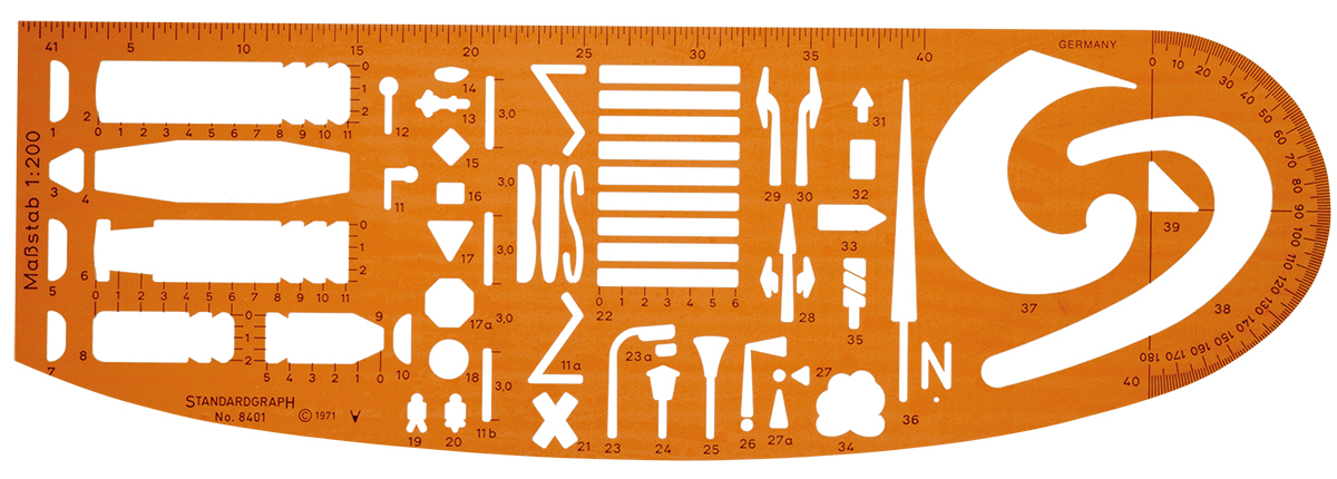 Template for traffic accident sketches. Vehicles, traffic signs, street lights, road markings and curves. For fine-fiber pen "S" as well as ink fountain pen 0.6 mm and fine-lead pencils.