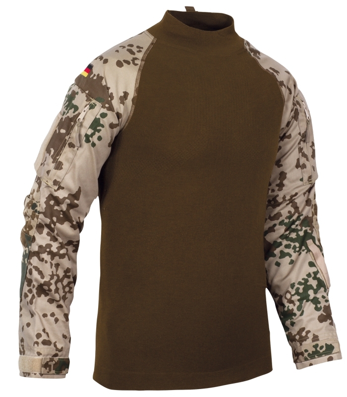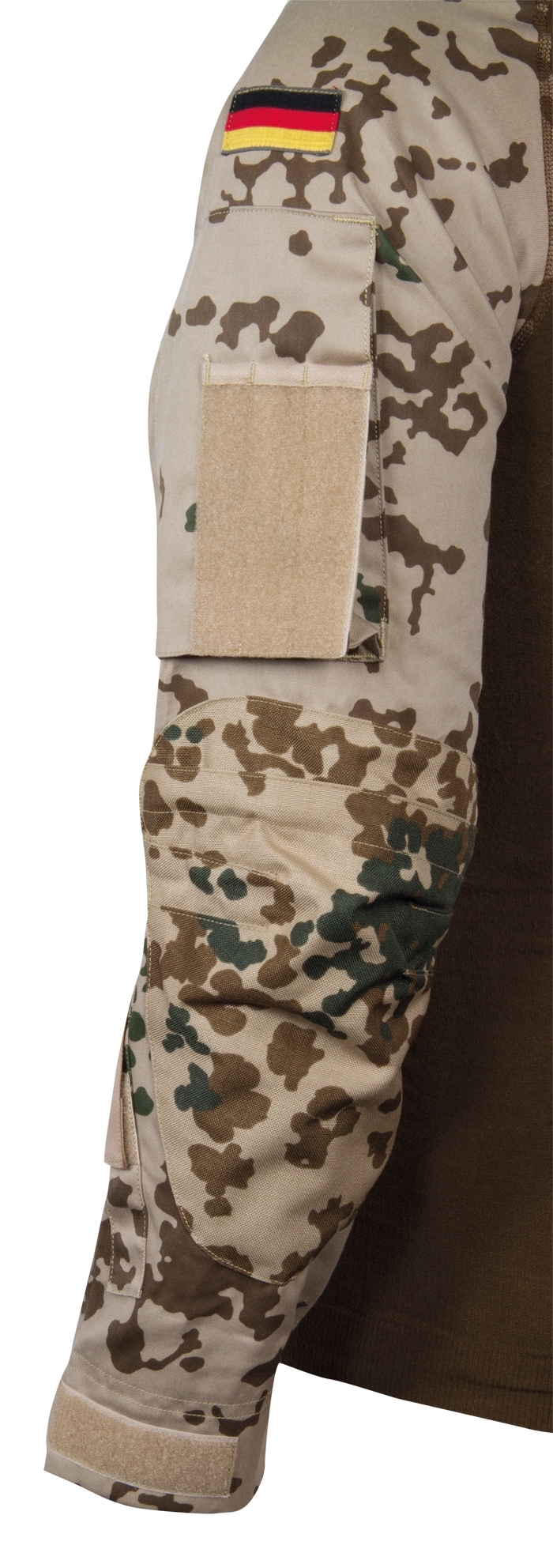 Original Combat Shirt SK in 3-color tropical camouflage for special forces of the Bundeswehr in used condition. Flame retardant and IR equipment as well as vector protection complete the high protection level of the IDZ Gladius system clothing.