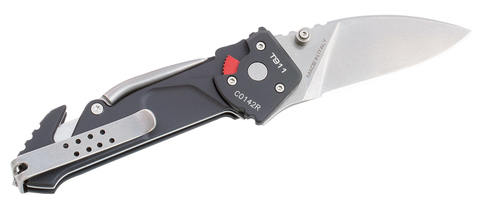 The handle features an integrated belt cutter with industrial-grade cutting blades, a tungsten carbide glass breaker, a folding stainless steel Marlin spike, and a flat-blade AISI 420 steel screwdriver to aid in scope adjustment. A clip is attached to the end of the handle for a deep concealed carry position. The clip can be reversed from left to right.