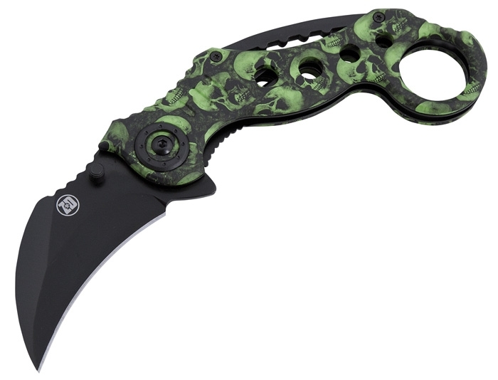 The original light metal handle has an interesting skull logo and is black and poison green.